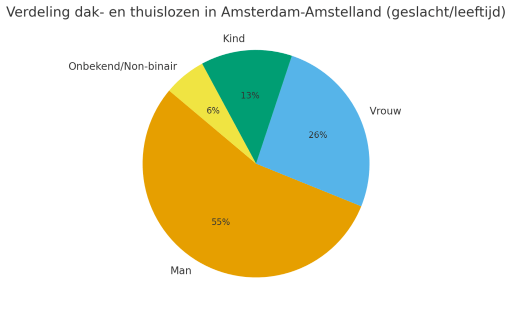 In Amsterdam zijn ruim 11.000 dak- en thuislozen, onder wie 1.400 kinderen. Slechts een klein deel slaapt op straat; de meesten verblijven tijdelijk bij vrienden, familie of in een garagebox. Hulporganisaties zeggen dat het probleem nog nooit zo groot is geweest.