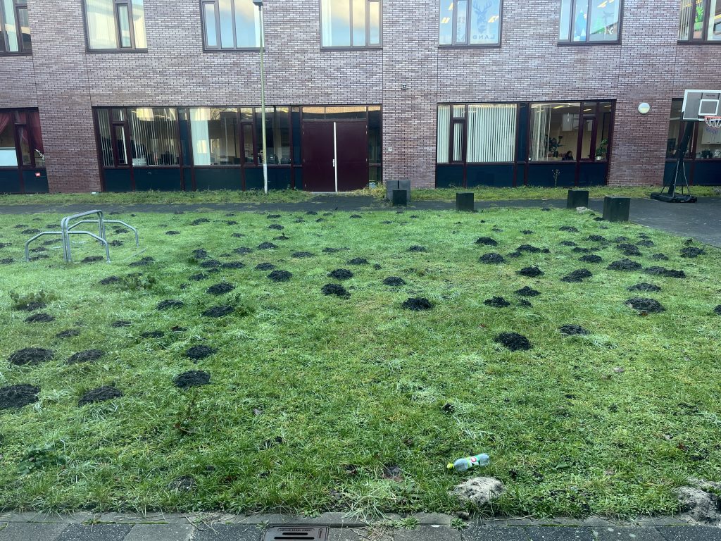 Wie is de mol die actief op het schoolplein aan het graven is? Iemand heeft meer dan vijftien molshopen achtergelaten op het schoolterrein.