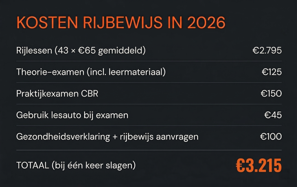 Een rijbewijs bestaat uit meer kosten dan alleen de rijlessen zelf. Je betaalt ook voor het theorie-examen, het praktijkexamen bij het CBR, de gezondheidsverklaring en de aanvraag van het rijbewijs bij de gemeente. Wie niet in één keer slaagt voor het praktijkexamen, betaalt bovendien opnieuw €138,50 voor een herexamen. Ongeveer de helft van alle examenkandidaten slaagt niet bij de eerste poging, zo blijkt uit cijfers van het CBR. De totale rekening kan daarmee flink oplopen.